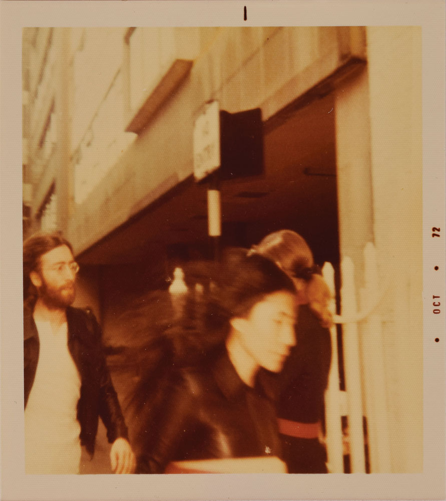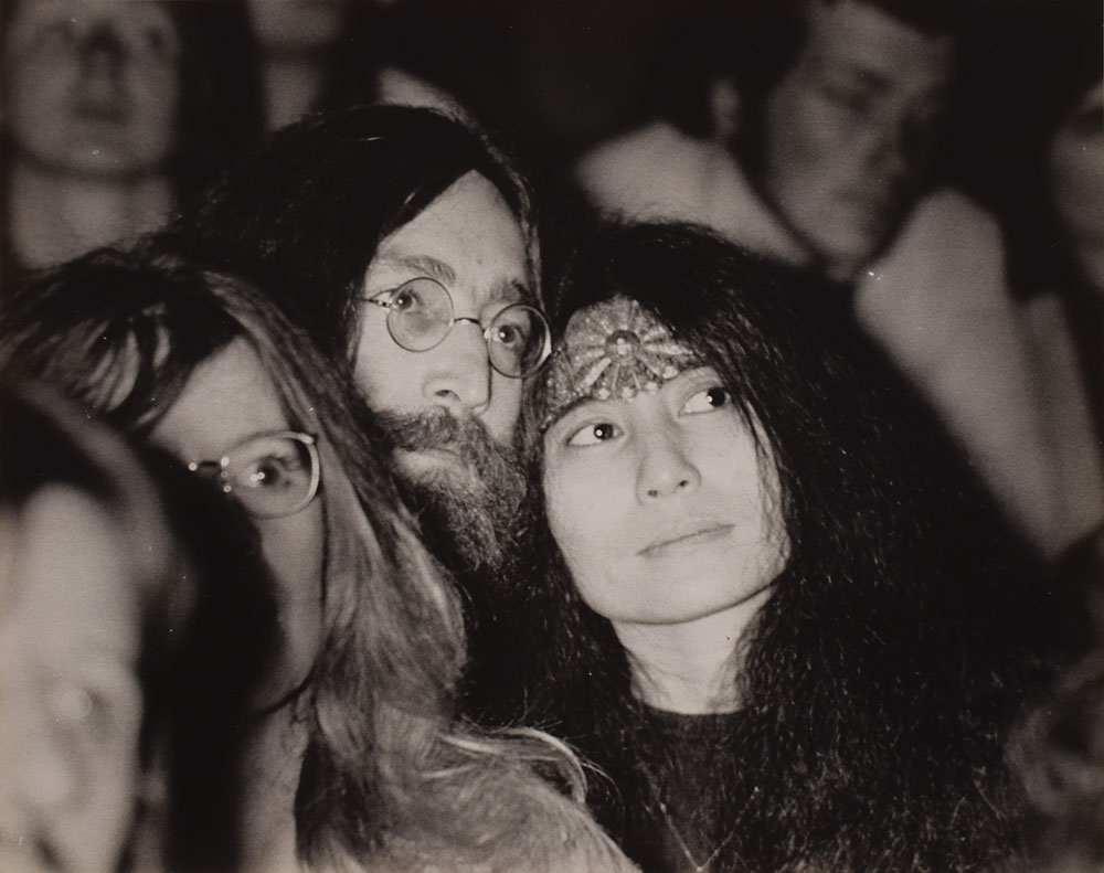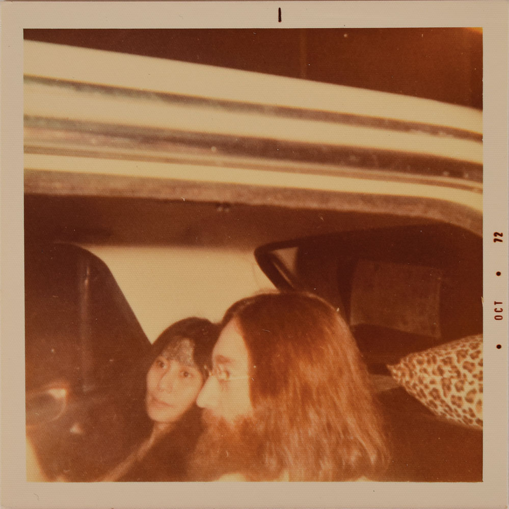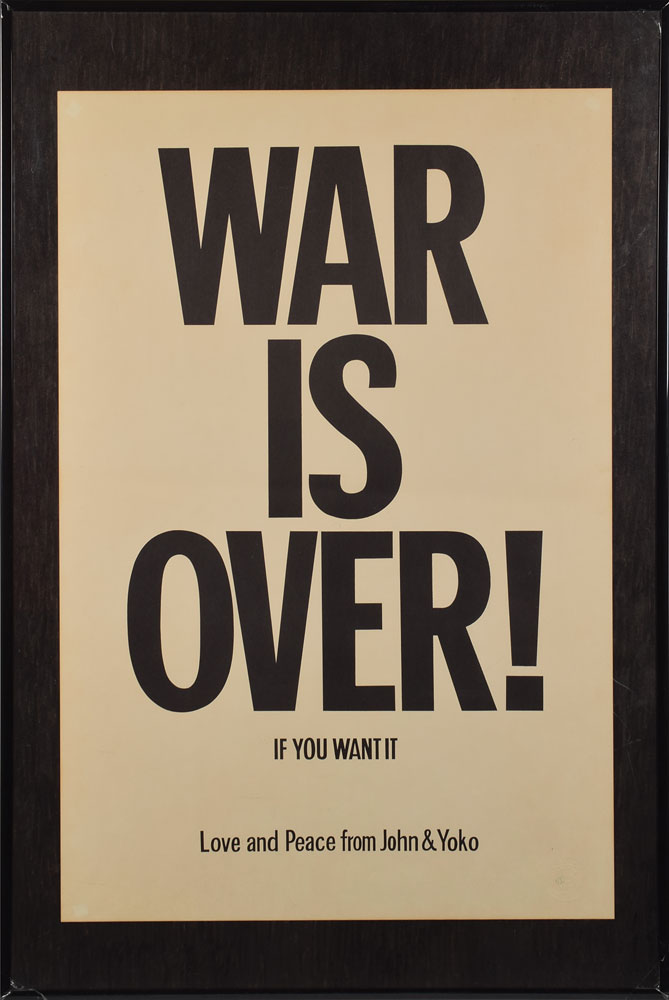 Interesting collection of the iconic poster and three rare photos, including: an off-white 20 x 30 poster with bold black text, reading, "War Is Over! If You Want It, Love and Peace from John & Yoko," blindstamped in the lower right corner, "Lennon-Ono, Original Gallery Ad, Certified 1970 to 1974"; two scarce original vintage color satin-finish 3.5 x 3.5 candids of John and Yoko together (taken in 1969 with a print date of October 1972); and an original vintage circa 1969 black-and-white glossy 10 x 8 photo of them at the Isle of Wight Bob Dylan concert. In fine condition, with some scattered creases.