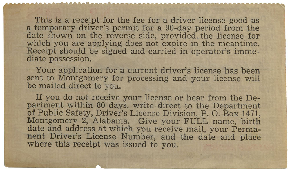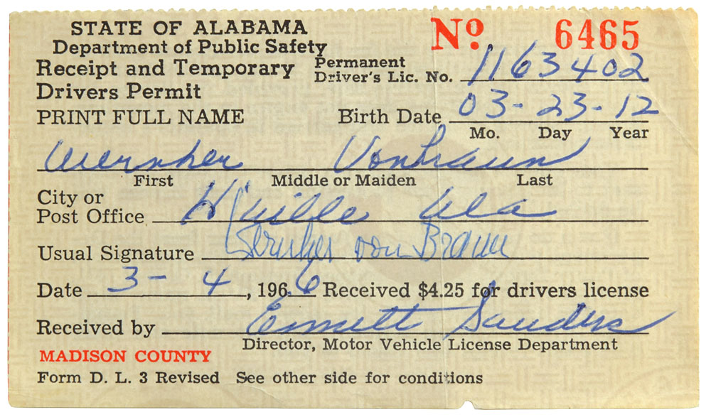 Wernher von Braun's driver's license receipt for Madison County in the state of Alabama, 4 x 2.25, dated March 4, 1966, signed in the "Usual Signature" field in blue ballpoint by von Braun. Issued as No. 6465, the receipt, which serves as "a temporary driver's permit for a 90-day period," lists von Braun's full name, birth date, "03-23-12," and the city or post office, "H'ville Ala." In fine condition, with a single vertical fold through one letter of the last name and a tiny chip to bottom.