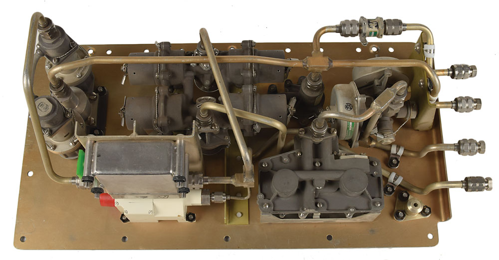 Apollo Block I Oxygen Control Panel by AiResearch Manufacturing Corp., measuring approximately 8.5 x 17.75 x 6.5. Designed to control oxygen supply in the Command Module, the panel features several buttons and inlets related to oxygen regulation, including: "S/M Supply," "Tank Pressure, "Emergency Inflow," and "Cabin Pressure." Also features a space for "Tool Storage," and options related to the PLSS (Primary Life Support System) and supply valve. Mechanical parts to reverse bear inspection stamps and several affixed green metal AiResearch labels. In fine condition. Panel includes a pressure transducer, a decidedly expensive component that was used in non-spaceflight systems and is often removed for separate sale. Deriving from the early pre-lunar Apollo mission, this Block 1 control panel was a vital instrument related to flight systems development and qualification of all unmanned missions.