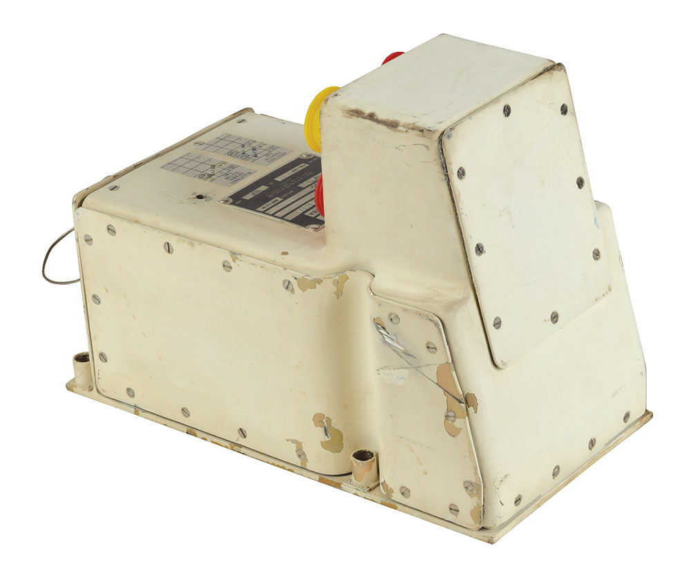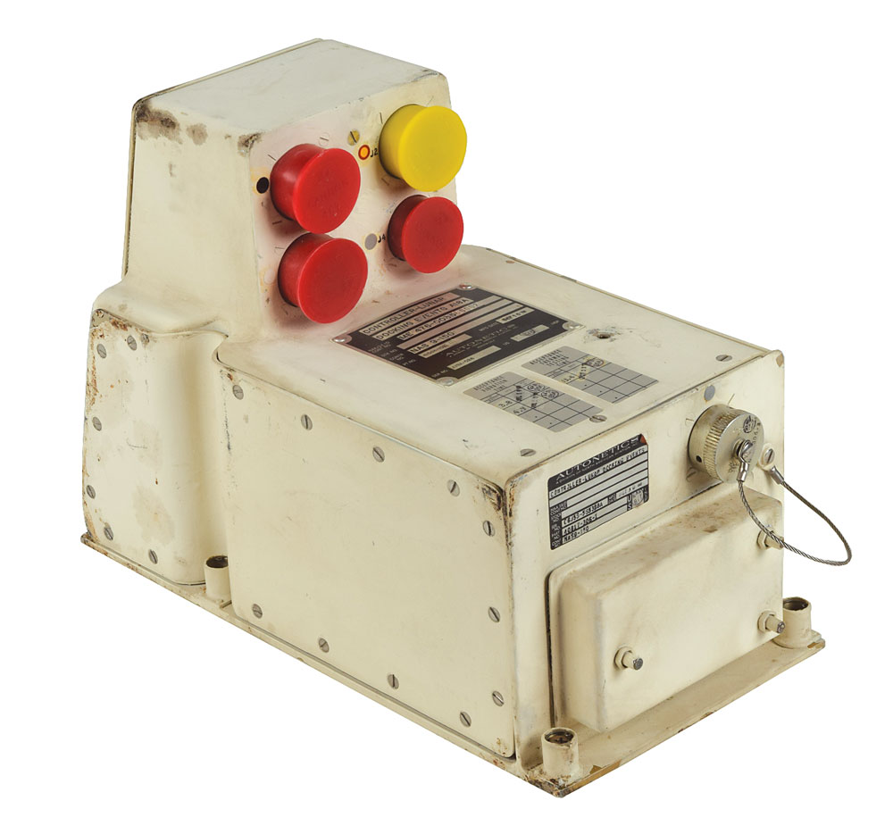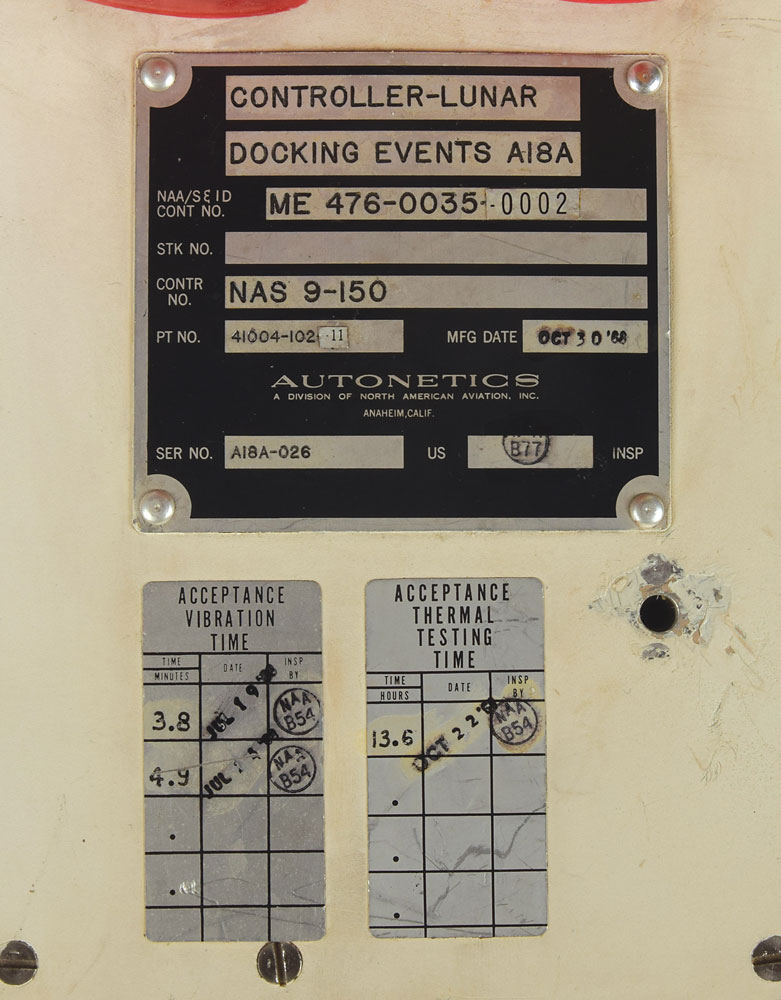 Apollo Command Module Lunar Docking Events Controller (LDEC) by Autonetics, 6 x 8.5 x 11.75, with four connectors on top labeled “J1” through “J4,” and a fifth on the front labeled “J5.” The main body of the controller bears four labels: a metal Autonetics label, reading: "Controller-Lunar Docking Vents A18A, NAASE ID, Cont No. ME 476-035-0002…Contr No. NAS 9-150, Pt No. 41004-102, Mfg Date. Oct 30 '68, Ser No. A18A-026"; labels for "Acceptance Vibration Time" and "Acceptance Thermal testing Time," both bearing inspection stamps, each respectively dated "JUL 19 '68" and "OCT 22 '68"; and a second Autonetics label, "Ser. No. 06359-565388A, Mfg. Date OCT 30 '68, Part No. 40817-306-1, Cont. No. NAS9-150." In fine condition. The LDEC, in parallel with the LM Separation Sequence Controller (LSSC), was responsible for energizing pyro squibs to separate the Lunar Module from the Spacecraft LM Adapter; it subsequently sequenced final separation of the LM docking ring during Lunar Module jettison from the Command Module.