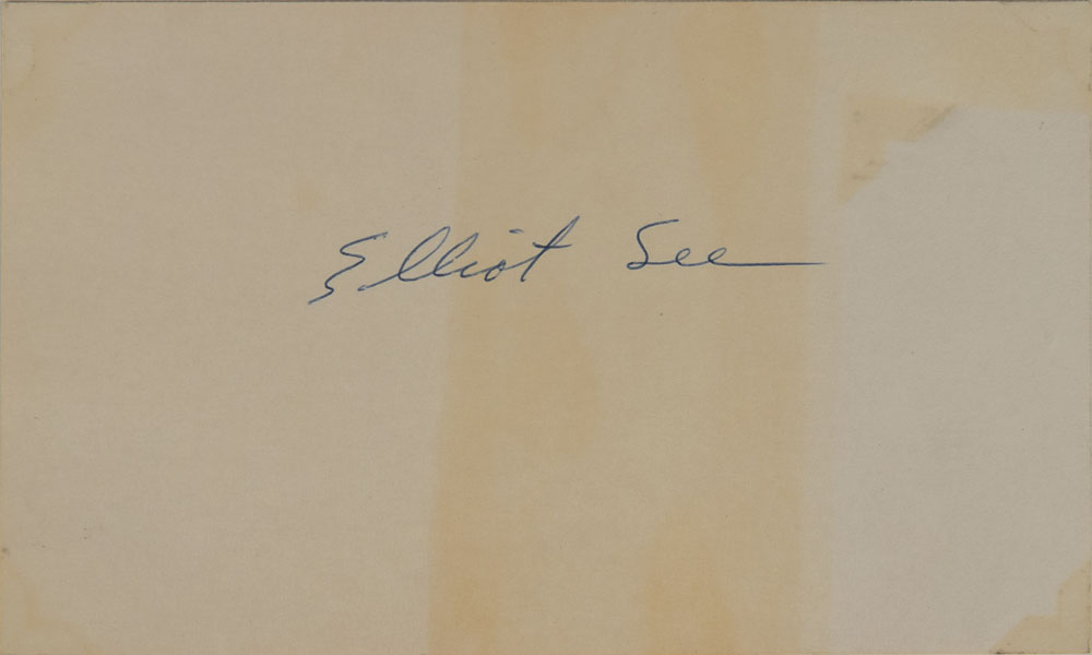 Original two-man crew of Gemini 9. Just three months before the mission, both Elliot See and Charles Bassett perished in a crash on February 28, 1966, while flying a T-38 jet trainer to the McDonnell Aircraft plant in St. Louis, Missouri. Two items: a ballpoint signature, "Elliot See," on an off-white 5 x 3 card; and a ballpoint signature and inscription, "To Peter B. Shikes with my very best wishes, C. A. Bassett," on an off-white 5 x 3 card, which is signed again on the reverse by Bassett. In overall very good to fine condition, with scattered toning, including a block over See's signature. Accompanied by the original NASA mailing envelope for the Bassett card, addressed in his own hand.