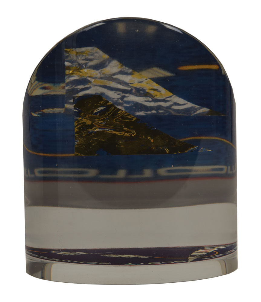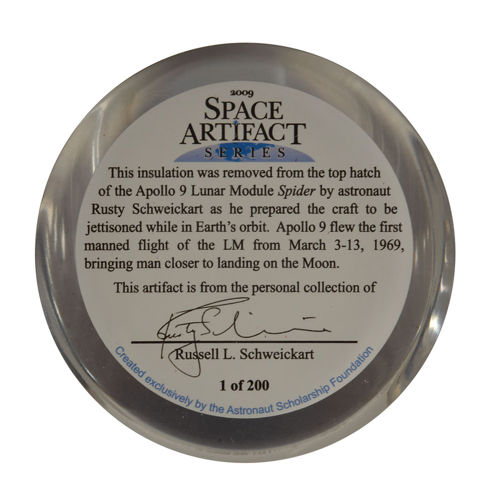 Flown Kapton foil insulation swatch, approximately 1.25 x 1.25, removed from the top hatch of the Apollo 9 Lunar Module Spider by Rusty Schweickart before the Spider was cast off into space. Encased in a limited edition cylindrical 2.75 x 3.25 piece of Lucite cut at an angle for display purposes, numbered 1/200, with a mission insignia and a certificate of authenticity at the bottom stating that the artifact originates from the personal collection of Rusty Schweickart. In fine condition. Originally distributed through the Astronaut Scholarship Foundation. Accompanied by its original matching box, numbered 1/200.