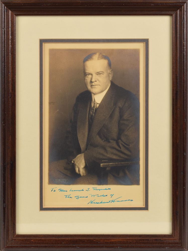 Matte-finish 6.5 x 10.75 photo of Hoover by Harris & Ewing, signed and inscribed in the lower border in fountain pen. Blindstamped in the lower left by Harris & Ewing. Double-matted and framed to an overall size of 12 x 16.5. In fine condition, with light silvering to darker areas of the image.