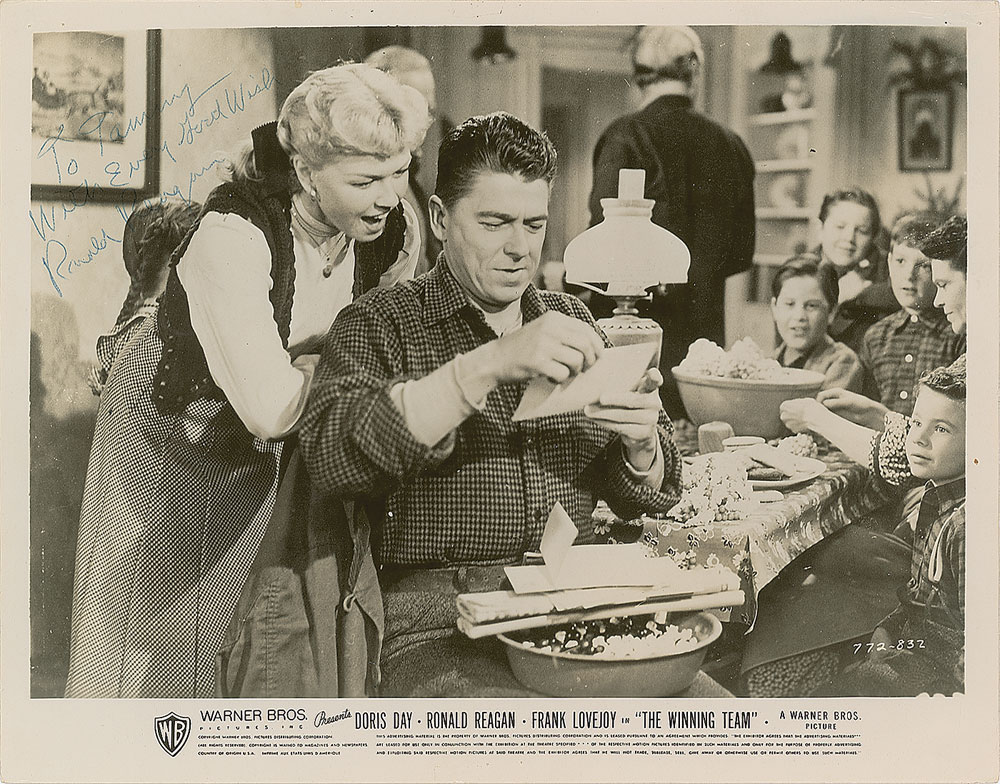 Vintage glossy 10 x 8 photo of Reagan and Doris Day in the 1952 film The Winning Team, signed and inscribed in black ballpoint, "To Tammy, with every good wish, Ronald Reagan.? In fine condition, with staple holes to edges.