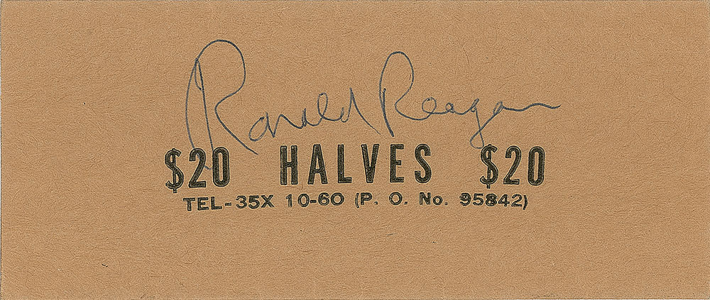 Beige coin roll for $20 of half dollars, 4.5 x 2, signed in black ballpoint by Reagan. In fine condition.