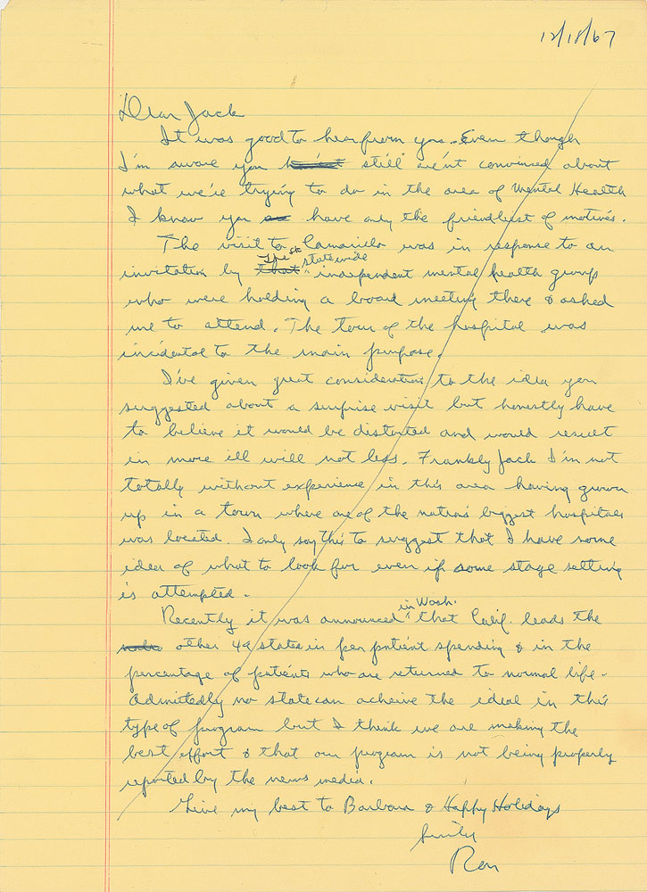 ALS as governor, signed ?Ron,? one page, lightly lined, 8.5 x 12, December 18, 1967. Draft letter to "Jack," in full: "It was good to hear from you. Even though I'm aware you still aren't convinced about what we're trying to do in the area of mental health I know you have only the friendliest of motives. The visit to Camarillo was in response to an invitation by the state wide independent mental health group who were holding a board meeting there & asked me to attend. The town of the hospital was incidental to the main purpose. I've given great consideration to the idea you suggested about a surprise visit but honestly have to believe it would be distorted and would result in more ill will not less. Frankly Jack I'm not totally without experience in this area having grown up in a town where one of the nation's biggest hospitals was located. I only say this to suggest that I have some idea of what to look for even if some stage setting is attempted. Recently it was announced in Wash. that Calif. leads the other 49 states in per patient spending & in the percentage of patients who are returned to normal life?admittedly no state can achieve the ideal in this type of program but I think we are making best effort & that our program is not being properly reported by the news media. Give my best to Barbara & Happy Holidays." Governor Reagan's secretary, Cathy Davis, penned the date above Reagan's letter, as well as drew a diagonal line in black ink across the text, indicating she had typed it for his signature. In fine condition.