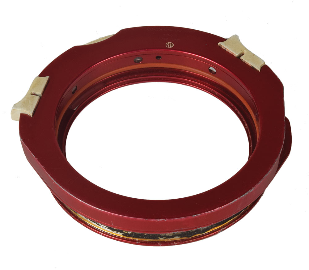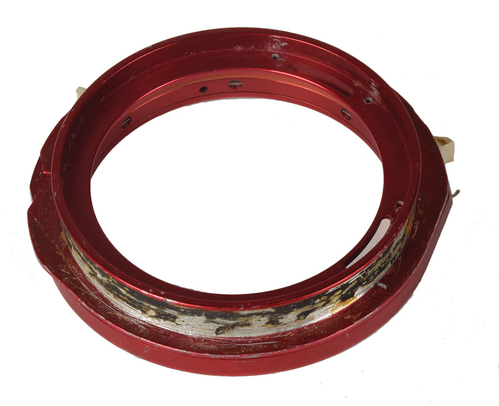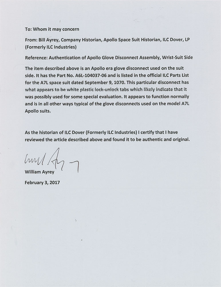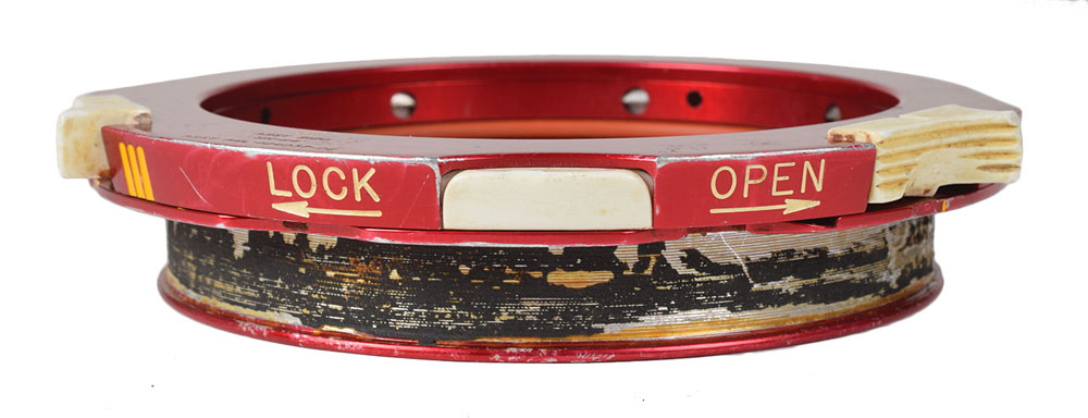Red metal wrist disconnect produced by Air-Lock for the Apollo space suit, measuring 5″ in diameter and 1″ thick, engraved with part numbers, “Assy 9120, SN-114, Assy A6L-104037-06.” This part number is listed in the official ILC Parts List for the A7L space suit dated September 9, 1970. This particular disconnect has white plastic locking tabs, and was probably used for some special evaluation; otherwise it is typical of the glove disconnects used on the model A7L Apollo suits. In very good to fine condition, with expected wear. This disconnect has been authenticated by Bill Ayrey, company historian at ILC Dover, the manufacturer of the Apollo, Shuttle, and Space Station suits, and is accompanied by a letter of authenticity.