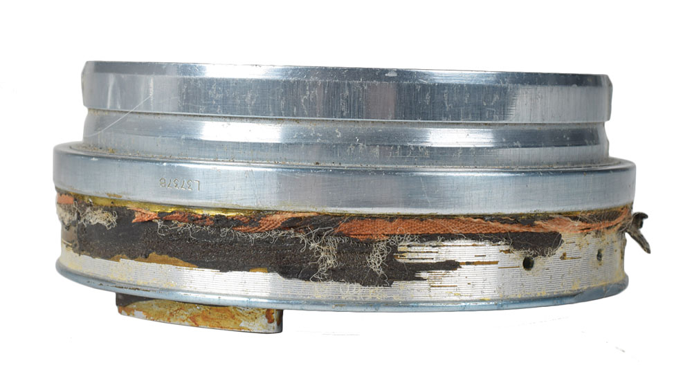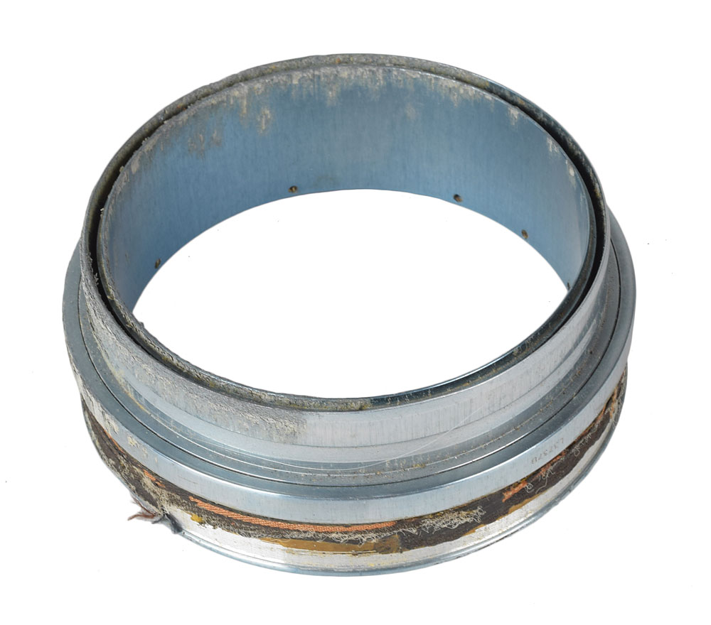 Metal glove-side connector believed to have been used as a prototype or for some specific testing during the development of the Apollo space suit, measuring 3.75″ in diameter and 1.25″ thick, engraved with part numbers on the inner rim, "L3736B," and outer edge, "L3737B." In very good condition, with overall wear.
