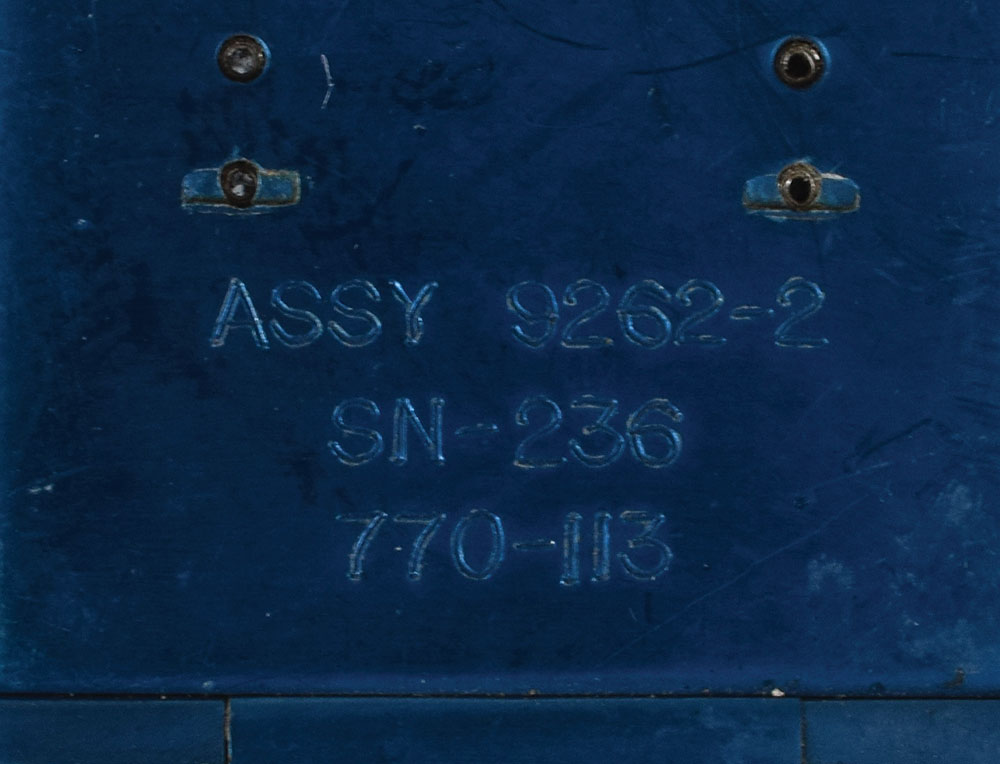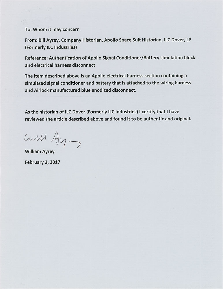 Apollo space suit internal electrical connector with battery pack and signal conditioner mock-up, featuring a weighted two-inch square wooden block to simulate the battery and signal conditioner unit, attached to a wiring harness with blue anodized disconnect made by Air-Lock. In very good condition, with some wear and soiling. This harness has been authenticated by Bill Ayrey, company historian at ILC Dover, the manufacturer of the Apollo, Shuttle, and Space Station suits, and is accompanied by a letter of authenticity. A rare, interesting Apollo suit artifact.
