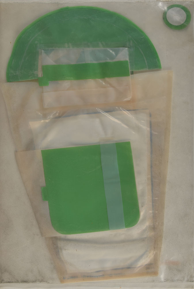 Unused Apollo fecal containment bag, 8.5 x 15, labeled: "By Dilectrix Corp. for Fairchild, Republic, OW/WMS Collection Unit, P/N 115D402104-101 Rev. F, S/N C.H. 1904, Date 10-72." Includes its NASA Manned Spacecraft Center parts tag. In very good to fine condition.