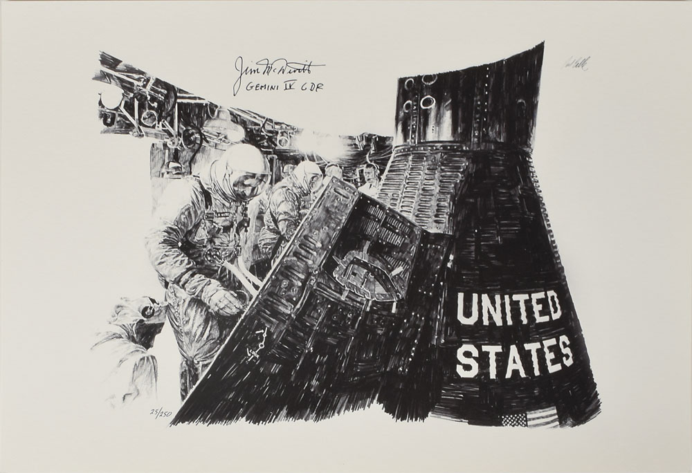 Limited edition 19 x 13 print of a pencil drawing by official NASA artist Paul Calle, depicting Gemini 4 command pilot Jim McDivitt suited up and entering the spacecraft capsule, numbered 25/250, signed in black ink, “Jim McDivitt, Gemini IV CDR.” In very fine condition.