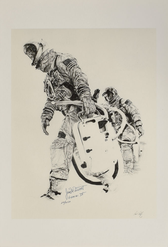 Limited edition 13 x 19 print of a pencil drawing by official NASA artist Paul Calle, showing Gemini 4 crew members Jim McDivitt and Ed White in their space suits and carrying equipment prior to their launch, numbered 24/250, signed in black ink, “Jim McDivitt, Gemini IV.” In very fine condition.