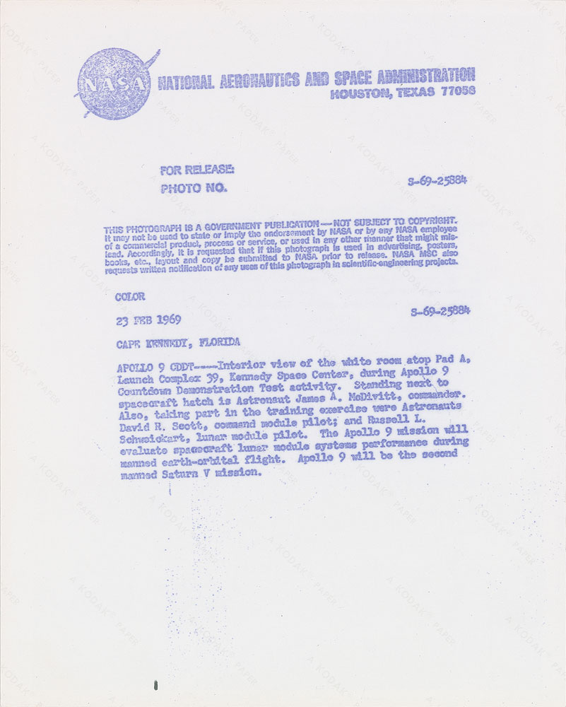 Official color glossy 10 x 8 red-numbered NASA photo of McDivitt during an Apollo 9 Countdown Demonstration Test activity, signed in black felt tip, "Jim McDivitt, Apollo 9 CDR." Reverse bears purple NASA caption text and “A Kodak Paper” watermarks. In fine condition, with some emulsion cracks to upper corners.