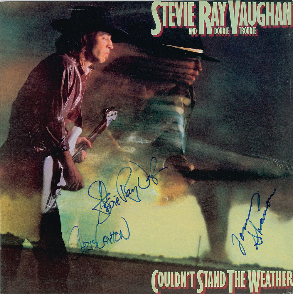 Couldn't Stand the Weather album signed on the front cover in blue felt tip by Stevie Ray Vaughan, Chris Layton, and Tommy Shannon. In fine condition. The record is not included.