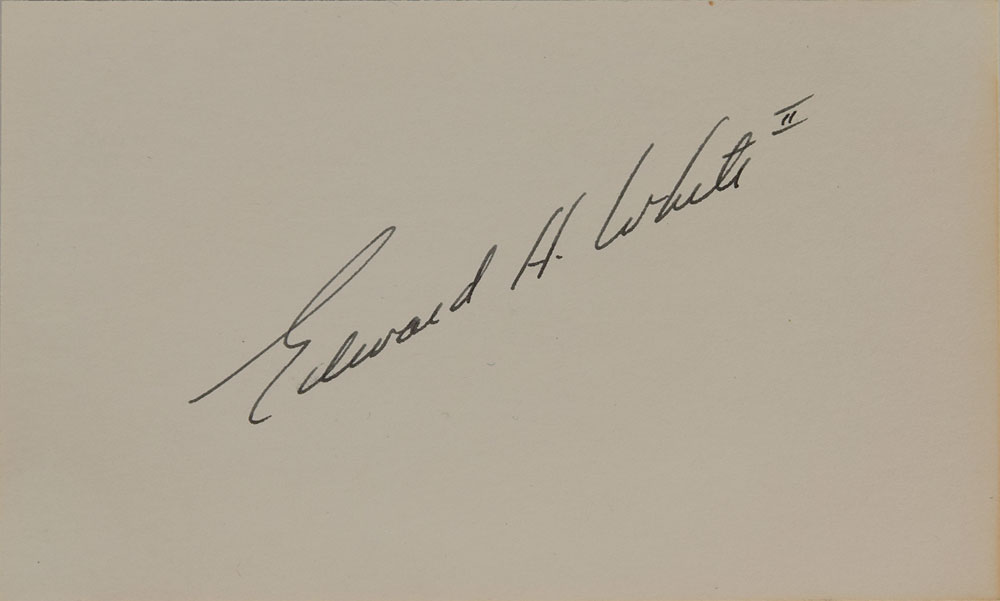 Ink signature, "Edward H. White II,” on an off-white 5 x 3 card. In fine condition. A desirable example from the first American to walk in space.