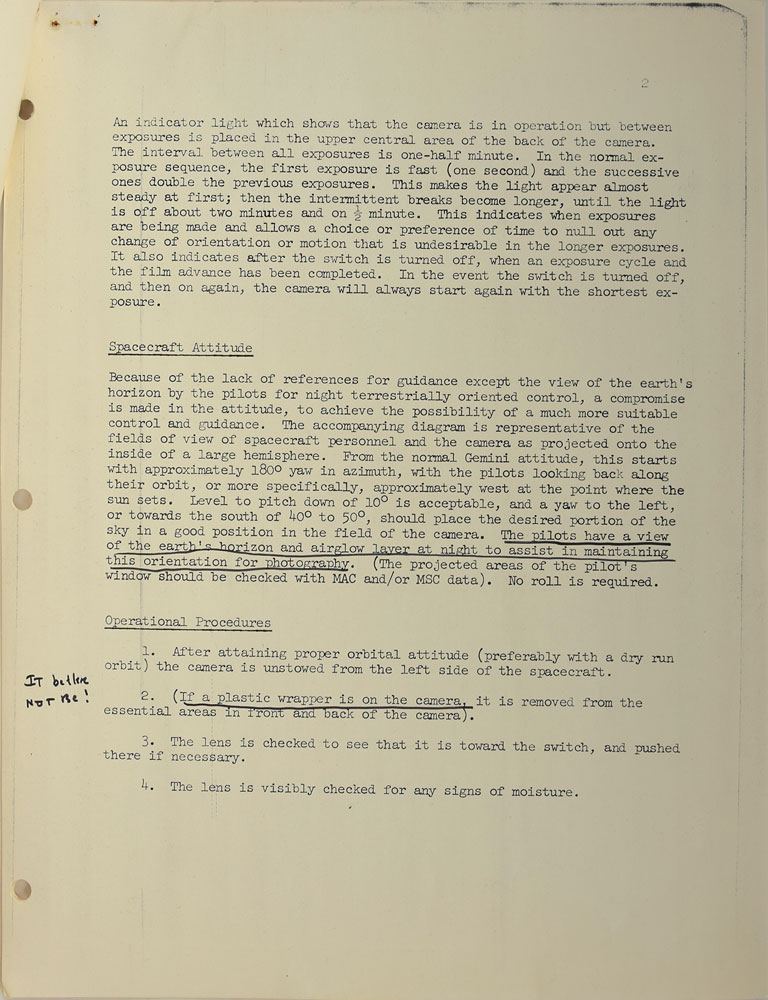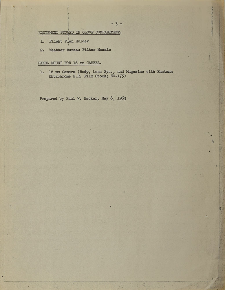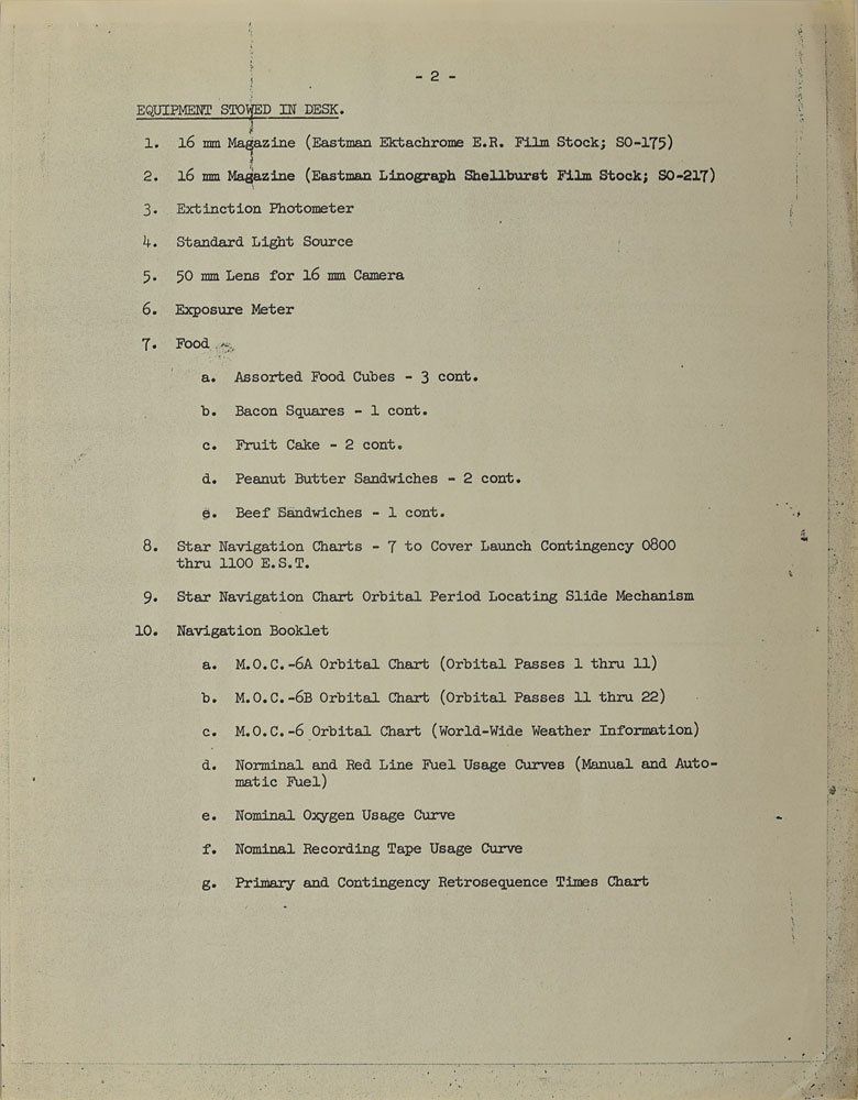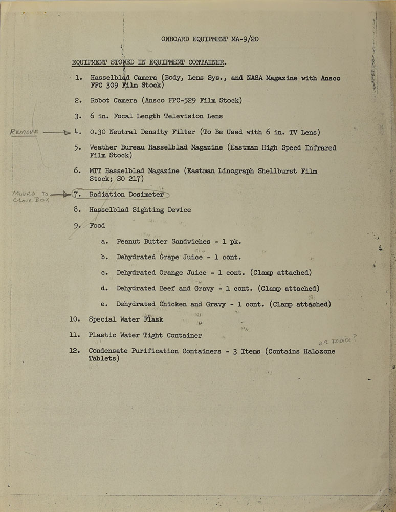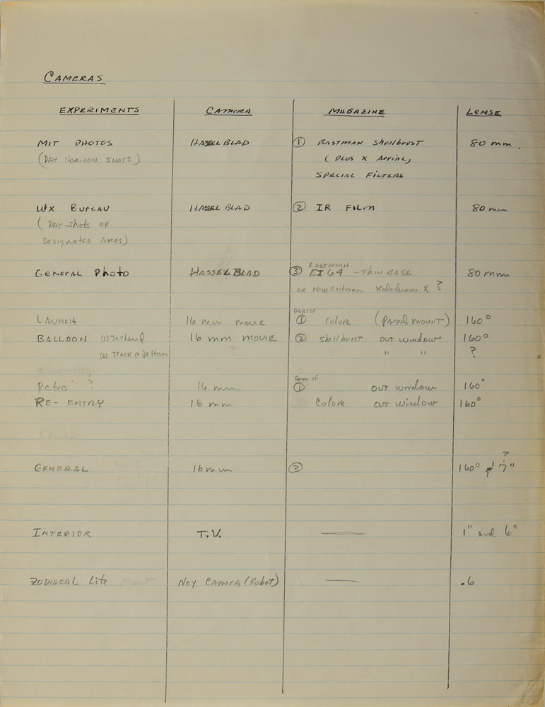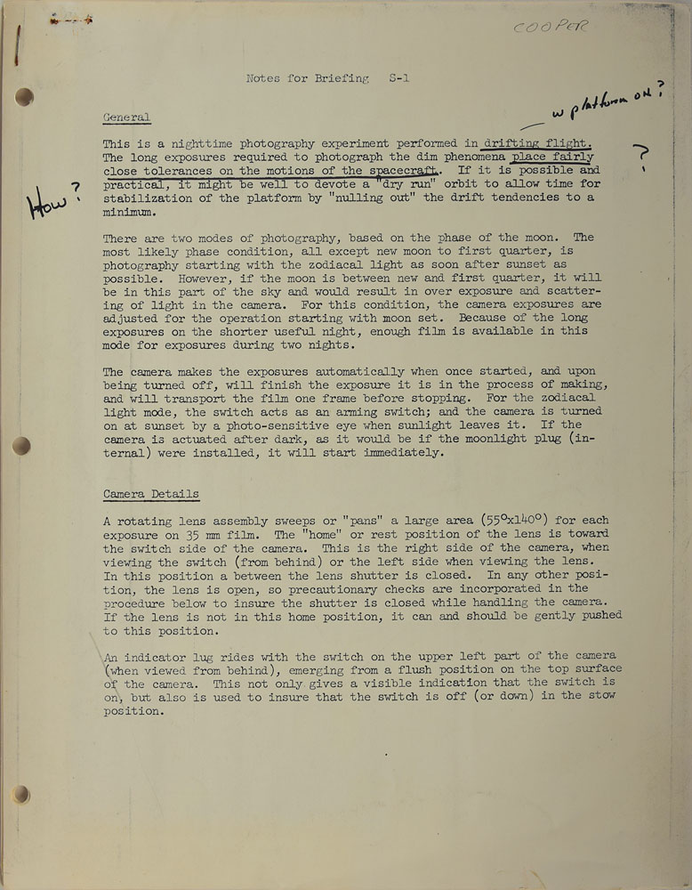 Among the most significant items are: a one-page list of experiments with associated cameras, magazines, and lenses penned by Cooper; a typed list headed “Onboard Equipment MA-9/20” listing photographic equipment taken on the mission and its location, heavily annotated in pencil by Cooper; a three-page list of onboard equipment with a couple annotations in Cooper’s hand; and briefing notes concerning “a nighttime photography experiment” annotated in Cooper’s hand, with a few passages underlined and some comments in the margins.