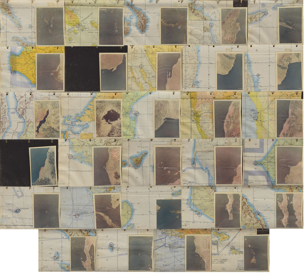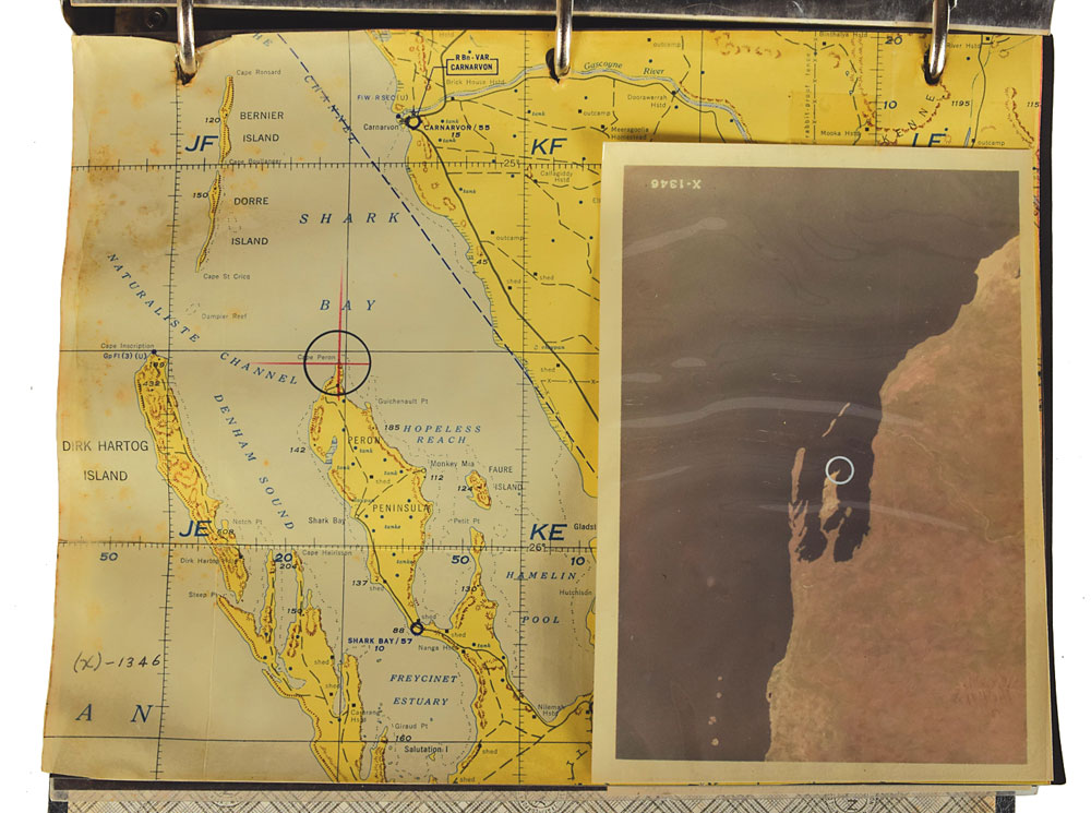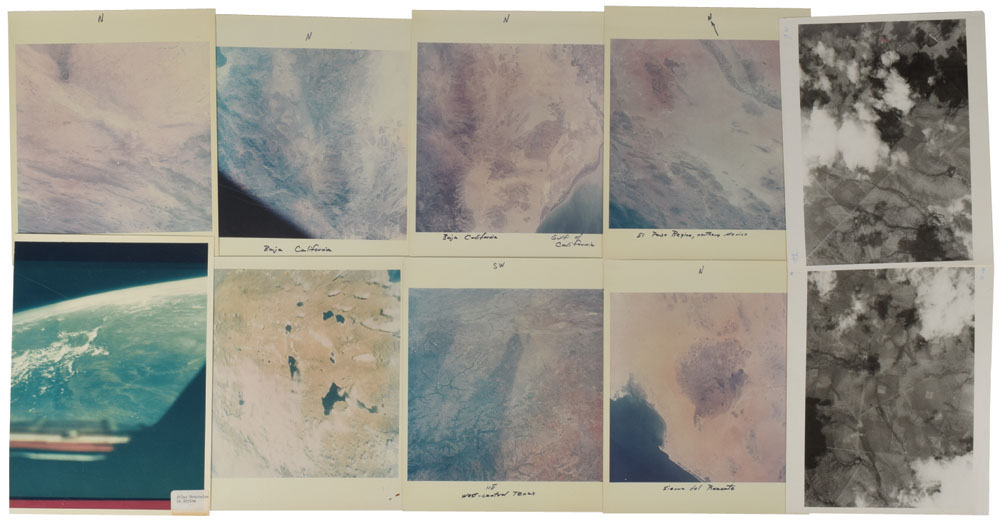 Photographs include: more than 600 original vintage glossy 8 x 10 black-and-white photos chronicling the history of MA-6 from Cooper’s training through the celebratory parade held upon his return; a binder labeled “In Flight Pictures MA-9” containing 15 color photos taken during flight, several annotated in Cooper’s hand, with subjects including the Atlas Mountains in Africa, Baja California, Mexico, Texas, China, and the Himalayas; a binder containing maps and matching photographs; and a handful of other associated press and NASA photos.