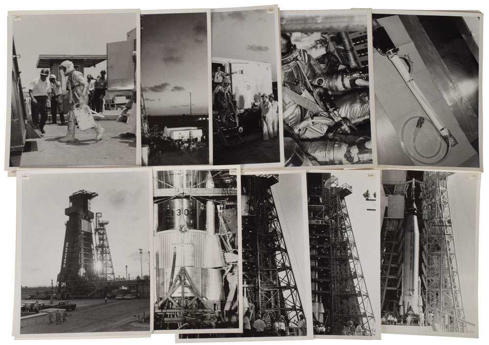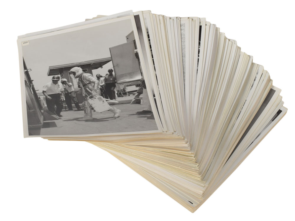 Also included are many pages of photography-related internal notes and memos, including: photographic index sheets for MA-9; a copy of a 1967 memo from John Young concerning photography in spaceflight; Cooper’s personal copy of a typed “Lunar Surface Superwide Hasselblad Camera Development Plan,” January 11, 1967; copies of technical drawings of camera components sent to Cooper; and other technical memos from the mid-1960s. Also includes a Hasselblad dark slide, though it is unclear what relation (if any) it has to the Hasselblad previously sold. In overall very good to fine condition.