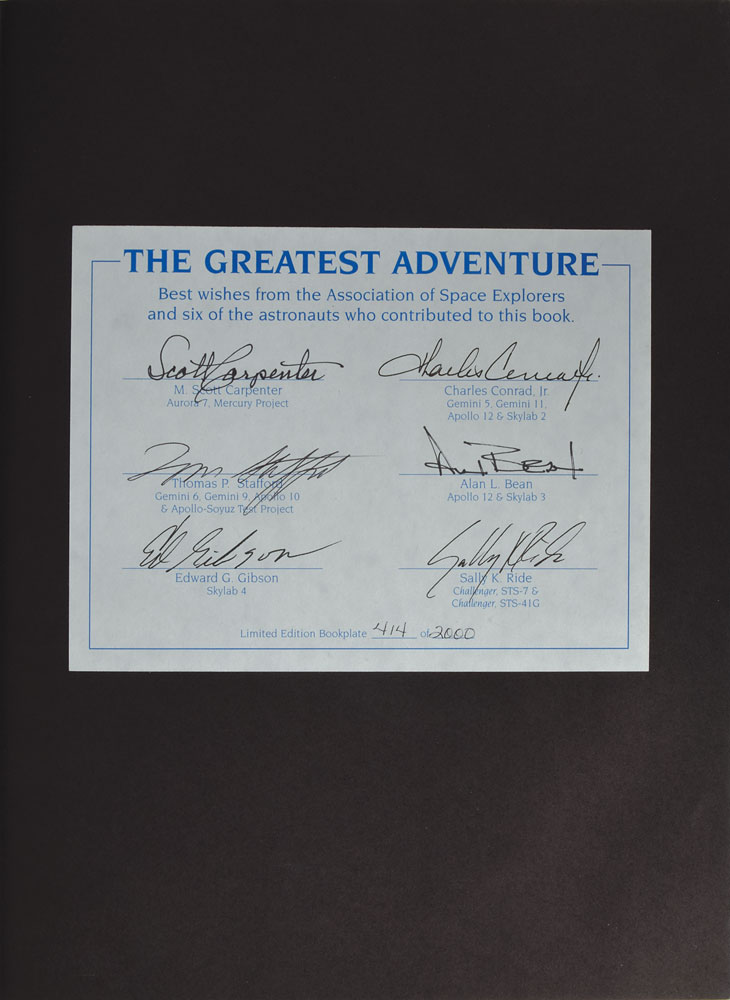 Signed book: The Greatest Adventure. Sydney, Australia: C. Pierson, 1994. Hardcover with dust jacket, 9.75 x 13, 224 pages. Signed in black ink on a limited edition bookplate, numbered 414/2000, by Scott Carpenter, Charles Conrad, Tom Stafford, Alan Bean, Ed Gibson, and Sally Ride. In fine condition, with scuffing to dust jacket.