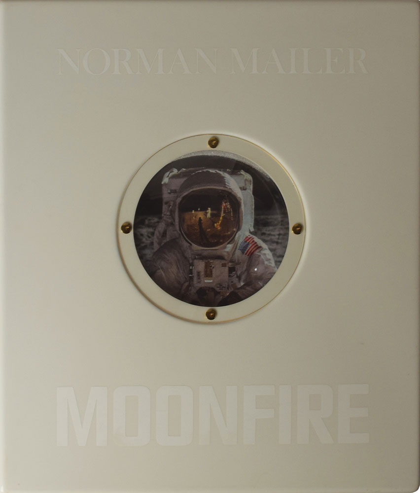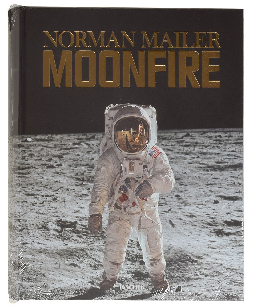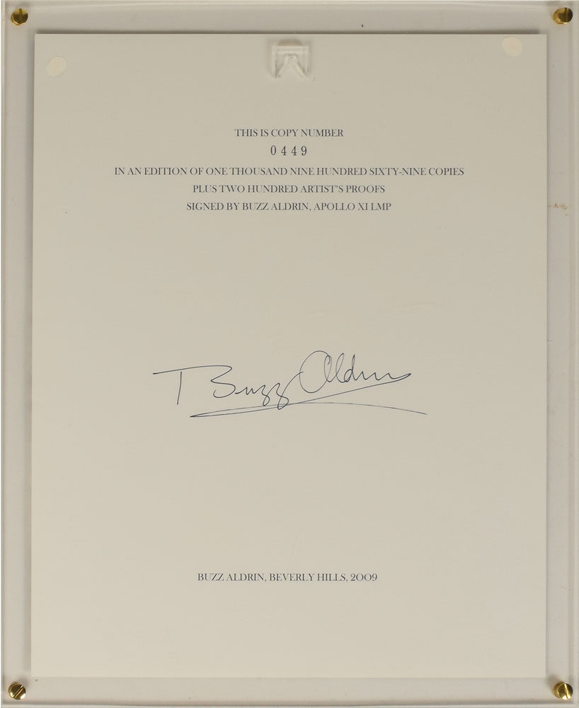 Outstanding color glossy 12.75 x 15.75 print of Aldrin on the lunar surface, numbered 449/1969, prominently signed on the reverse in black felt tip; with its associated limited edition oversized book: Moonfire by Norman Mailer. Germany: Taschen, 2009. Hardcover with presentation box, 15 x 18, 348 pages. Aldrin photo is displayed in its original plexiglass frame. In fine condition.