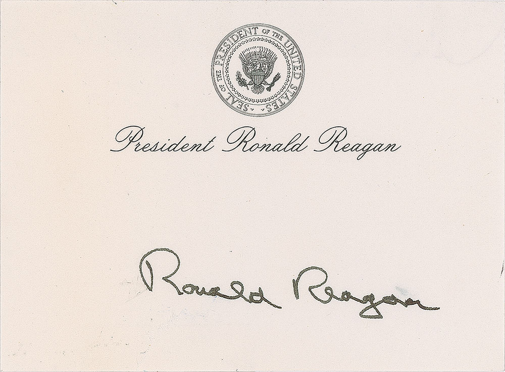 Felt tip signature, "Ronald Reagan,” on an off-white 4 x 3 sheet of presidential stationery. In fine condition, with a short tear to the lower edge, repaired on the reverse with archival tape.