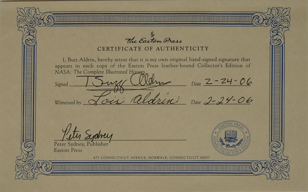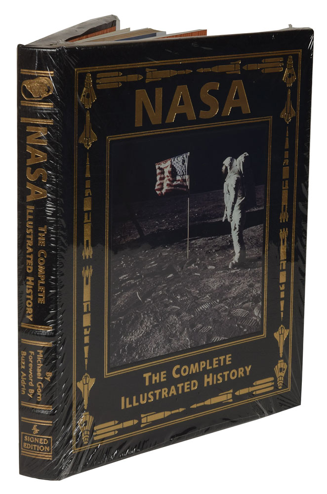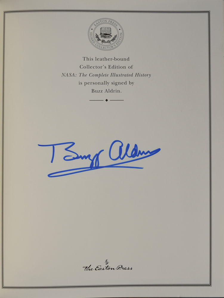 Signed book: NASA: The Complete Illustrated History. Collector's edition. Norwalk, CT: Easton Press, 2005. Leatherbound hardcover, 10 x 11.25, 303 pages. Signed on the colophon in blue felt tip by Aldrin. In very fine condition.