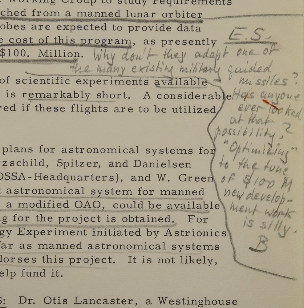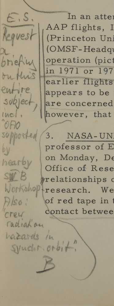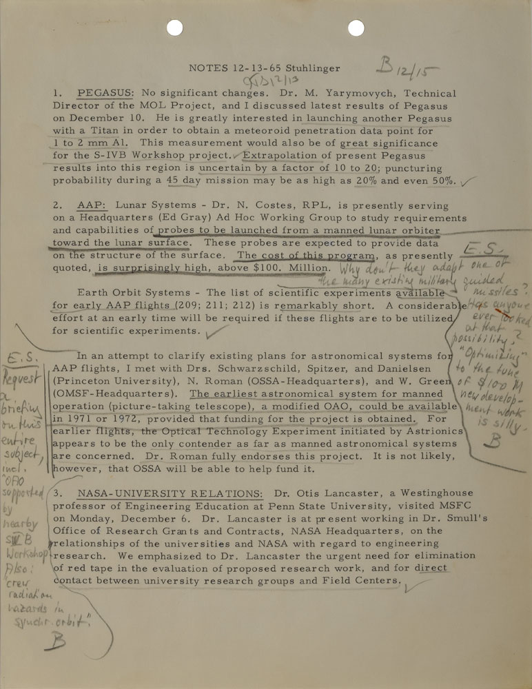 Incredible typed notes from German rocket scientist Ernst Stuhlinger, two pages, 8 x 10.5, dated December 1965 and January 1966, bearing several pencil notations made by Wernher von Braun, who has added his initial "B" a total of four times, adding the date to two in his own hand. In addition to numerous check marks and underlines, von Braun makes specific notes for Stuhlinger on the second topic entitled "AAP," offering his thoughts on budgeting for a planned launch of lunar probes from a manned lunar orbiter: "E. S., Why don't they adapt one of the many existing military guided missiles? Has anyone ever looked at that possibility? 'Optimizing' to the tune of $100 M new development work is silly." Von Braun follows up on the status of a new astronomical system for manned operation, "a modified OAO," and its potential availability: "E. S., Request a briefing on this entire subject, incl. 'OAO supported by nearby SVB Workshop.' Also: 'crew radiation hazards in synchr. orbit.'" The second page is empty, with the exception of von Braun's initial and date, "B 1/10." Stuhlinger's notes themselves are of particular interest, with the first topic referencing the launch of the third Pegasus satellite, and the last highlighting the relationship between NASA and the nation's universities, noting the visit of Dr. Otis Lancaster of Penn State University. In fine condition. Still two years away from officially establishing the Apollo Applications Program, these incredible notes display the scope of NASA's ambitions and meticulous organization. The success of the Pegasus satellites and MOL Project paved the way for lunar research, with NASA launching the Surveyor I on June 2, 1966, marking the first US soft lunar landing. Two months later, the Lunar Orbiter 1 photographed smooth areas of the lunar surface for selection and verification of safe landing sites for the Surveyor and Apollo missions.