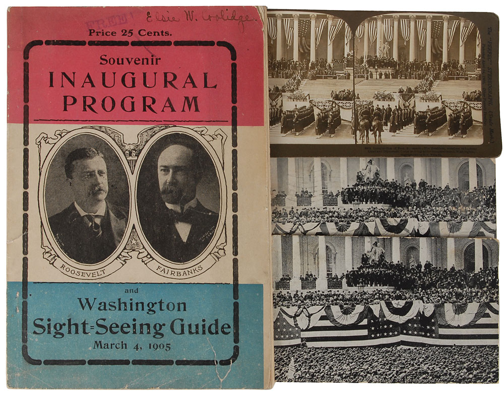 Twelve pieces of presidential ephemera: an 1860 Union electoral ticket from Virginia for John Bell and Edward Everett; two different 1864 Democratic tickets from Ohio for George B. McClellan and George H. Pendleton; an engraving for the memorial service held for Garfield in Washington on February 27, 1882, bearing facsimile signatures of John Sherman and William McKinley; a program sheet for the services held for William McKinley in Dayton, Ohio, on September 19, 1901; a fifty-page Roosevelt-Fairbanks souvenir inaugural program and Washington sight-seeing guide for March 4, 1905; an original stereoview photo of Roosevelt's 1905 inauguration by H. C. White; two identical postcards depicting the crowd at Taft's 1909 inauguration; an engraved pass for admission to the 1912 Republican National Convention in Chicago; an engraving for the memorial service of Woodrow Wilson, held in Washington on December 15, 1924; and an official program for the inaugural ceremonies of Herbert Hoover and Charles Curtis in 1929. In overall very good to fine condition.