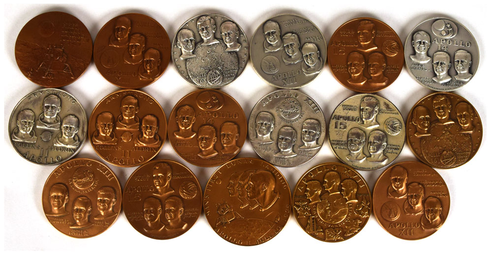 Very desirable and uncommon set of seventeen medals honoring the seven manned missions of the Apollo program. Manufactured by the Medallic Art Co. of New York, the set features bronze and pure silver medals for each mission, with the exception of Apollo 17 and a special Apollo 11 medal with JFK quote on reverse, both of which only come in bronze; missions 11, 12, and 15 each have an additional bronze medal. All but one measure 2.5″ in diameter (JFK measures 2.75″ in diameter), and each medal features raised images of the crews on the front, and either a notable quote or moment on the reverse. Six of the medals are accompanied by their original boxes. In overall fine condition.