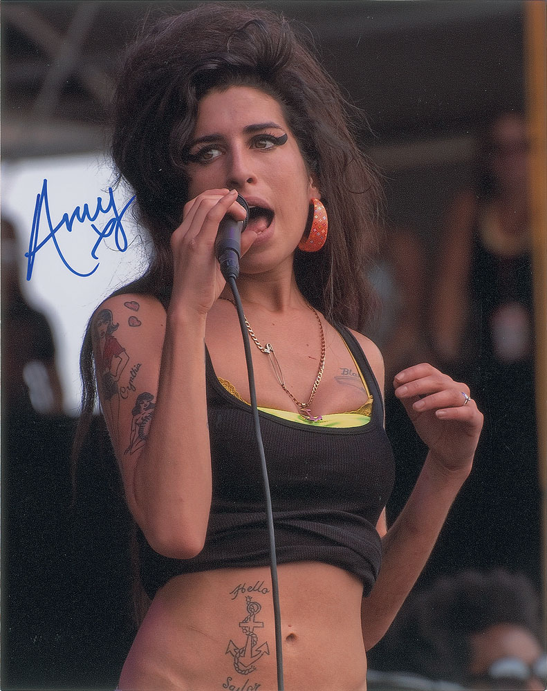 Desirable color satin-finish 8 x 10 half-length photo of Winehouse during a performance, signed in blue felt tip, "Amy, x." In very fine condition. Accompanied by a letter of provenance from the original recipient, in part: "This photograph was signed by Amy Winehouse in the Camden area of London on the 15th May, 2011. Just a few months before her death."