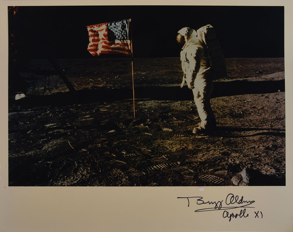 Color semi-glossy 10 x 8 full-length photo of Aldrin standing near the American flag on the lunar surface, signed in the lower border in black felt tip, "Buzz Aldrin, Apollo XI." In fine condition, with a spot above signature.