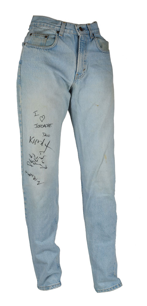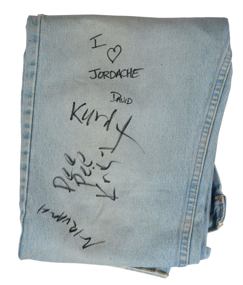 Extremely rare pair of blue Gap jeans, loose fit, 30 x 34, signed on the right pant leg in black felt tip, "I [heart] Jordache, David," "Pee Pee, Krist," and "Kurdt," who adds "Nirvana" below. In fine condition, with light stains and expected wear. Accompanied by a full letter of authenticity from REAL, a Kerrang! magazine from December 11, 1993, a photo of the jeans signed by Krist Novoselic, an original ticket stub for a Nirvana concert at Atlanta's Omni on November 29, 1993, and a copy of a letter of provenance, originally addressed to Novoselic on June 19, 2012, in part: "I recently was fortunate to acquire a signed Gap Jeans that was signed by Kurt Cobain, Dave Grohl and you. This was signed at the Atlanta's Omni Arena 'In Utero' on November 29, 1993 after the concert. Attached are pictures of the signed Gap jeans." In support of their recently released third and final studio album In Utero, Nirvana played to a packed Omni arena on November 29, 1993. Following the concert Cobain was interviewed by Kerrang! magazine for an exclusive on-tour update that likewise offered a glimpse into the jovial mood of its players. When asked why he seemed so optimistic, Cobain responded: "Well, things are great. And another thing that has added to it has been after every show I'm totally pleased to go out to the bus and talk to the kids out there...All we ever wanted to do was break down the rock 'n' roll myth, wanting to show that all Rock stars were just people. And it's such a nice peaceful moment with these kids after the show—they just wanna say 'Hi and thanks for playing your music.'"