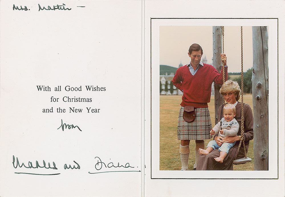 Royal Christmas card from 1983 with embossed gold emblems on the front, measuring 10.5 x 7.25 open, featuring an affixed color photo of Charles in a kilt and Diana sitting on a swing with toddler Prince William, signed and inscribed inside in fountain pen, “Mrs. Martin—from Charles and” and “Diana.” In fine condition.