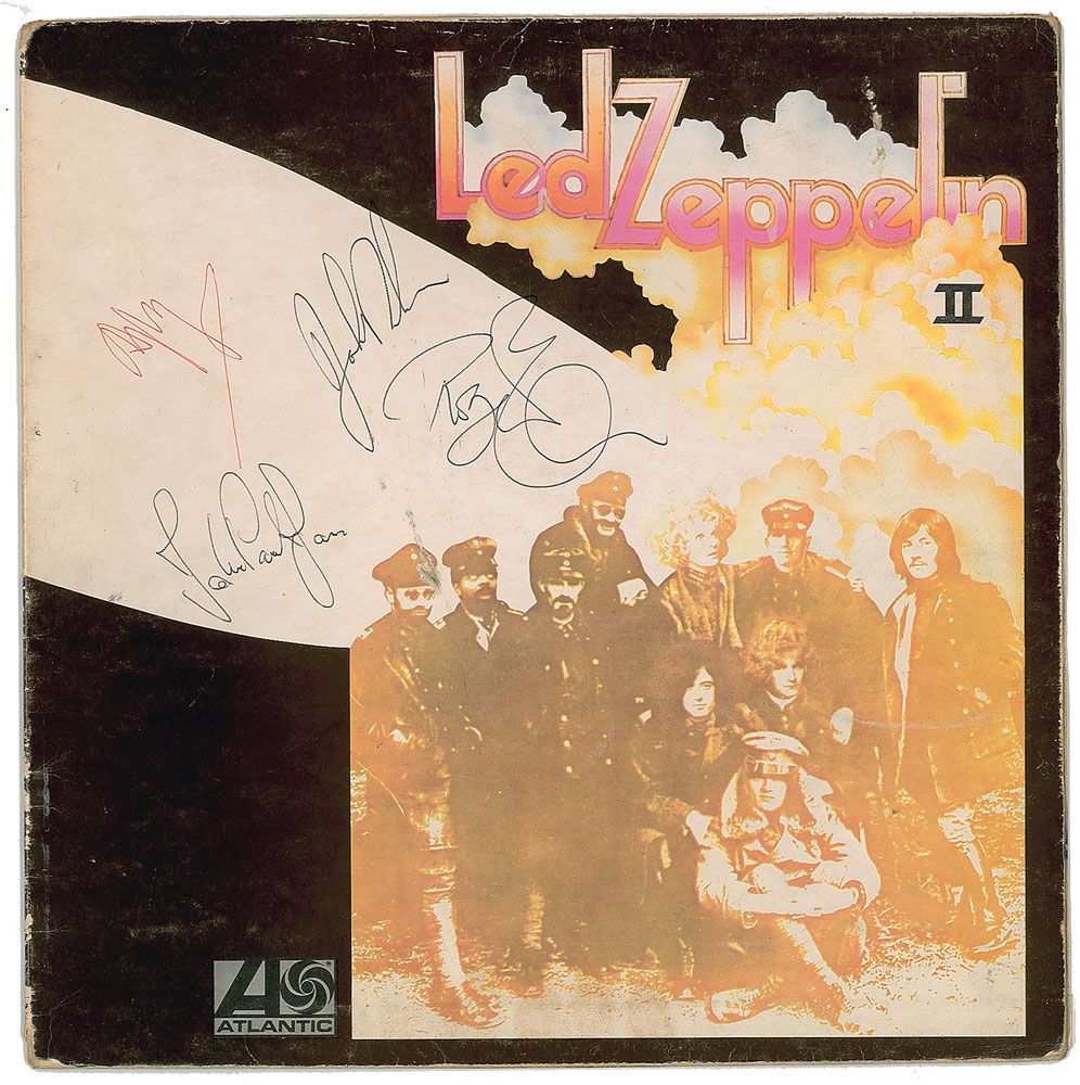 Led Zeppelin II album signed on the front cover in black ballpoint by John Paul Jones, John Bonham, and Robert Plant, and in red ballpoint by Jimmy Page. In very good to fine condition, with light soiling, edge wear, and two gouges to the front cover not affecting the signatures or overall appearance. The record is included. Accompanied by a letter of provenance from the original recipient, in part: "As a young lad trying to earn some 'pocket money' in the late 1970's and early 1980's I did gardening work for some family friends. One of my jobs was to keep the back yard of their hairdressing salon…tidy and weed free. I was very much into my rock music at this time and because of this the family friends introduced me to Pat Bonham who was, along with Zoe and Jason Bonham, a regular client at the salon. Early in 1980, when I saw her in the salon, I asked Pat if she could get the band to autograph an album cover for a friend as a birthday present…A few weeks later I was called on the telephone and told to get to the salon ASAP…I found Pat with the album for my friend (only signed by Robert Plant) and also with…the album cover I am writing about. It was Led Zeppelin II and had been autographed by all four members…According to Pat it had been left by a girl for the whole group to sign and she had forgotten who the girl was. It had been 'kicking around the house for ages' and as such Pat decided that I should have it as I hadn't asked for any autographs for myself." Upon its release in late October 1969, Zeppelin’s eponymously titled sophomore effort became an instant, monster success within the US and UK, and quickly cemented the quartet as the next great British rock act. Given the era’s passive attitude towards autograph collecting and the increased security implemented by Zeppelin’s now legendary manager Peter Grant, band-signed items remain exceptionally scarce. There are reportedly less than thirty known fully signed Led Zeppelin albums extant. A true rock history rarity.