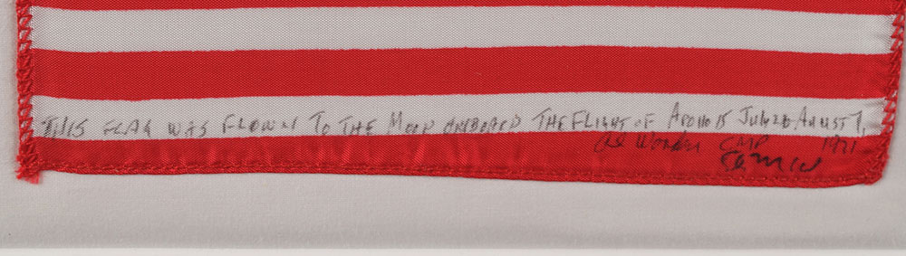Desirable flown American flag carried on Apollo 15, 6 x 4, signed and flight-certified in black ink, "This flag was flown to the moon onboard the flight of Apollo 15, July 26-August 7, 1971, Al Worden, CMP." The flag has been lightly stitched to a larger piece of archival material, and matted and framed to an overall size of 11.75 x 9.75. In fine condition.