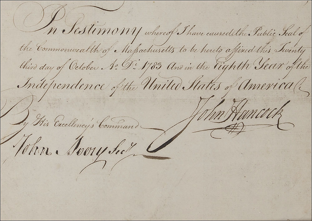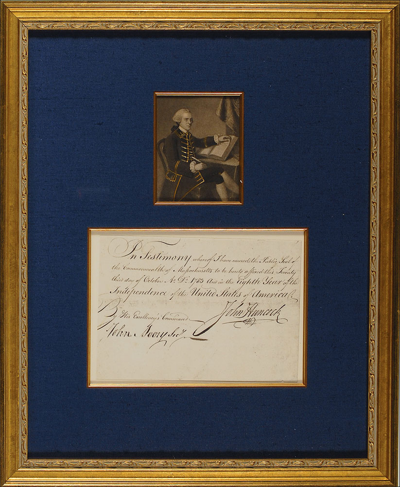 Self-contained partial manuscript DS, one page, 8 x 5.75, October 23, 1783. The bottom portion of a larger document with six lines of text, in full: "In Testimony whereof I have caused the Public Seal of the Commonwealth of Massachusetts to be hereto affixed this Twenty third day of October Ao. Di. 1783 and in the Eighth Year of the Independence of the United States of America." Boldly signed at the conclusion by Hancock and countersigned by John Avery as secretary. Handsomely mounted, cloth matted, and framed with a portrait to an overall size of 16 x 19.5. In fine condition, with uniformly trimmed edges.