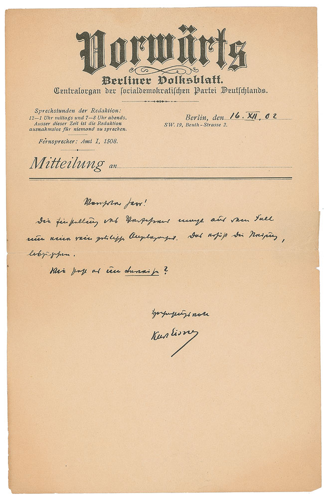 Jewish journalist, theatre critic, and radical leader (1867–1919) who was assassinated shortly after overthrowing the Wittelsbach monarchy in Bavaria. Untranslated ALS in German, one page, 5.75 x 8.75, Vorwarts letterhead, December 16, 1902. In fine condition, with a small area of creasing to the right edge.