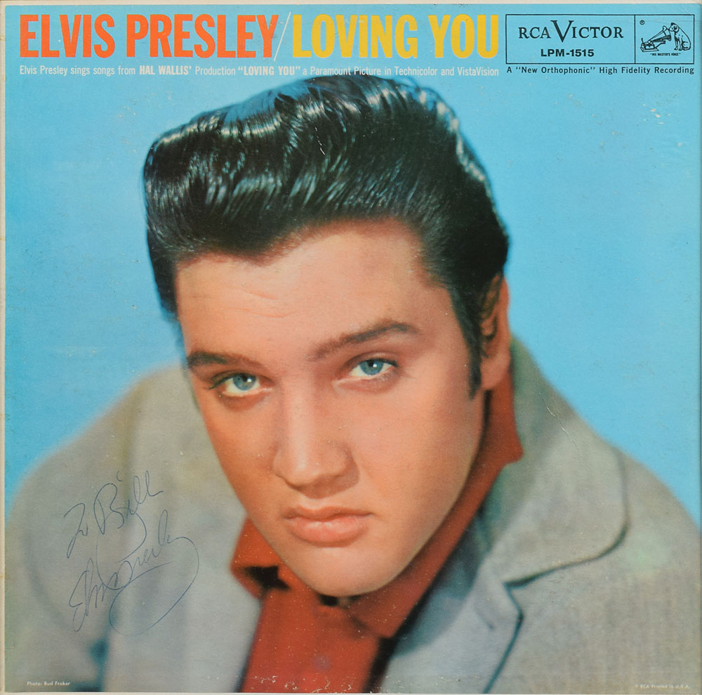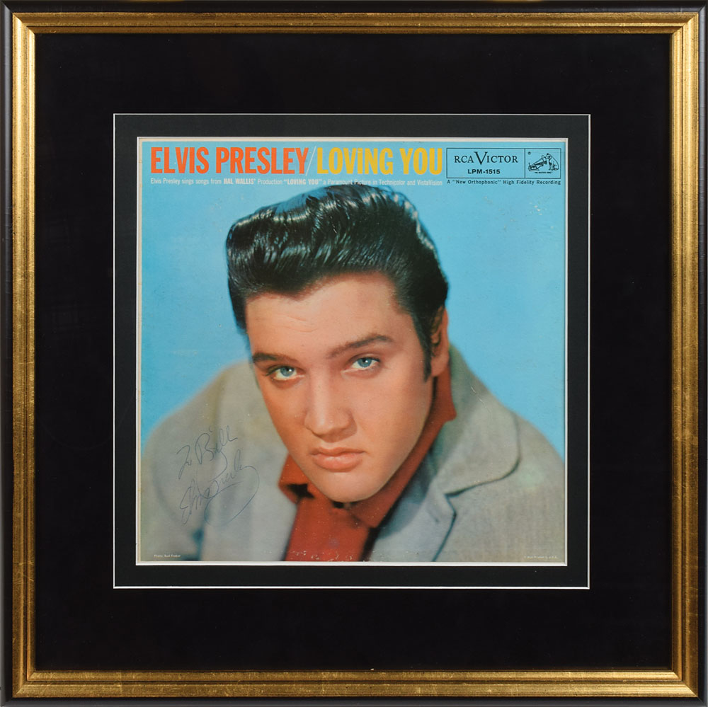 Loving You album signed and inscribed on the front cover in black ballpoint, "To Bill, Elvis Presley." Archivally double-matted and framed to an overall size of 20.25 x 20.25. In fine condition, with a few light creases visible only at an angle.