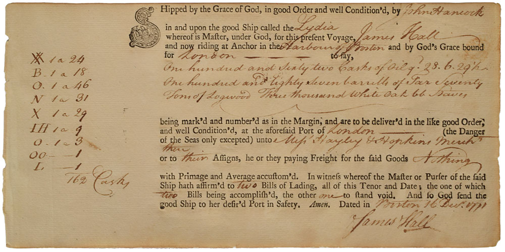 Partly-printed ADS, signed within the text, "John Hancock," one page, 9 x 4.25, December 16, 1771. A bill of lading filled out by Hancock, in part: "Shipped by the Grace of God, in good Order and well Condition'd, by John Hancock in and upon the good Ship called the Lydia whereof is Master, under God, for this present Voyage James Hall and now riding at Anchor in the Harbour of Boston and by God's Grace bound for London to say, one hundred and sixty two casks of Oil?one hundred and eighty seven barrells of Tar, Seventy Four of Logwood, Three thousand white oak?staves." In fine condition.