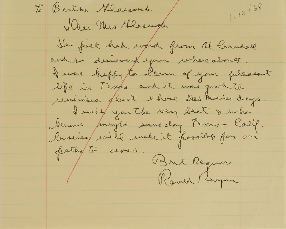 ALS as governor, one page, lightly-lined, 8 x 6.25, January 16, 1968. Draft letter to Bertha Glasscock, in full: ?I've just had word from Al Crandall and so discovered your where abouts. I was happy to learn of your pleasant life in Texas and it was good to reminisce about those Des Moines days. I wish you the very best & who knows maybe some day Texas-Calif. business will make it possible for our paths to cross.? Governor Reagan's secretary, Cathy Davis, penned the date above Reagan's letter, as well as drew a diagonal line in red ink across the text, indicating she had typed it for his signature. In fine condition.
