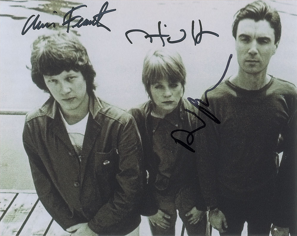 Satin-finish 10 x 8 photo of the Talking Heads, signed in black felt tip by David Byrne, Chris Frantz, and Tina Weymouth. In fine condition, with a somewhat grainy image quality. Accompanied by a full letter of authenticity from REAL and photos taken at the time of signing.