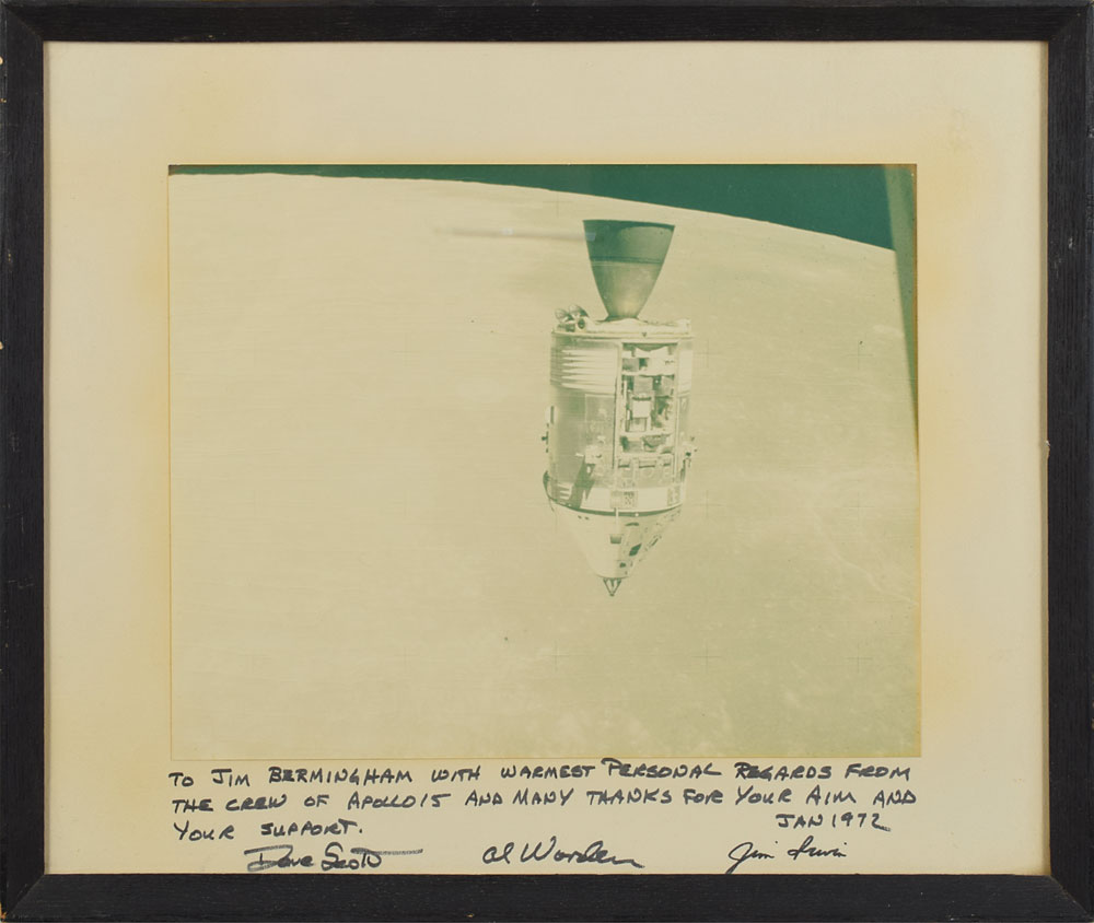 Official color glossy 9.5 x 7.5 NASA photo of the command module Endeavour floating high above the moon, affixed to its original 12.5 x 10.5 mount, signed and inscribed on the mount in black felt tip, "To Jim Birmingham with warmest personal regards from the crew of Apollo 15 and many thanks for your aim and your support, Dave Scott," "Al Worden," and "Jim Irwin." Framed and in fine condition, with some fading to the image, but not to the signatures.
