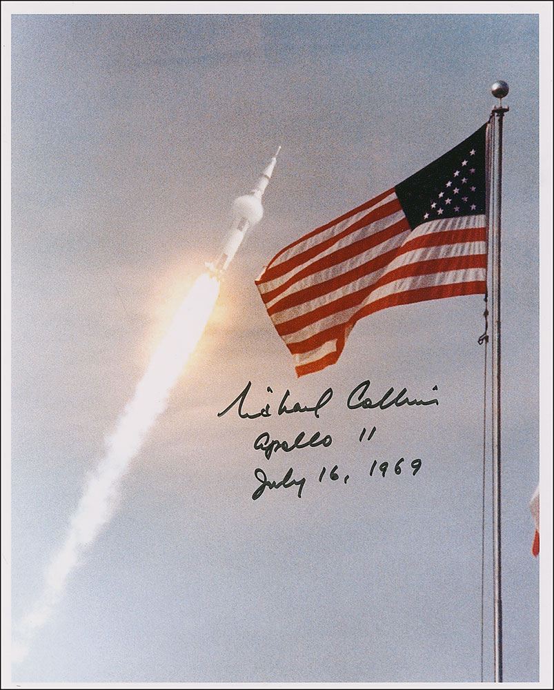 Color satin-finish 8 x 10 photo of the liftoff of Apollo 11, signed in black felt tip, “Michael Collins, Apollo 11, July 16, 1969.” In very fine condition.