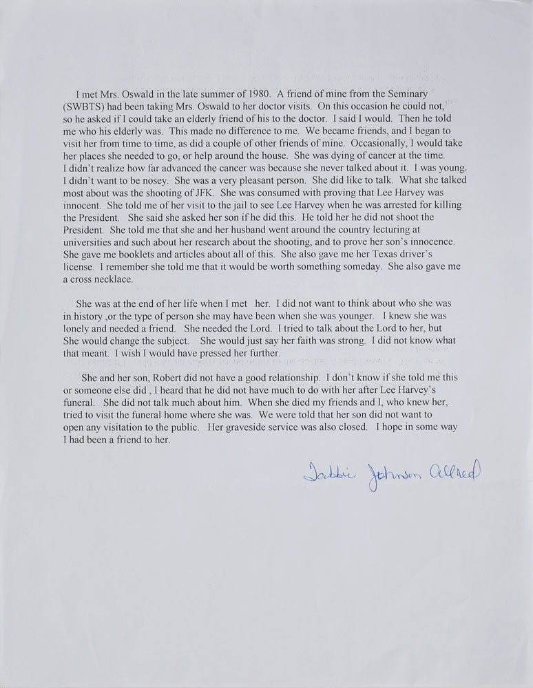 Oswald’s personal Texas driver’s license, 3.25 x 2, with an expiration date of July 19, 1972, featuring her personal details, photo, and facsimile signature. In fine condition, with her personal details faded but legible. Accompanied by a detailed letter of provenance from Mrs. Oswald’s friend, in part: “She was dying of cancer at the time…she did like to talk. What she talked most about was the shooting of JFK…she told me of her visit to the jail to see Lee Harvey when he was arrested for killing the President. She said she asked her son if he did this. He told her he did not shoot the President…She also gave me her Texas driver’s license. I remember she told me that it would be worth something someday.”