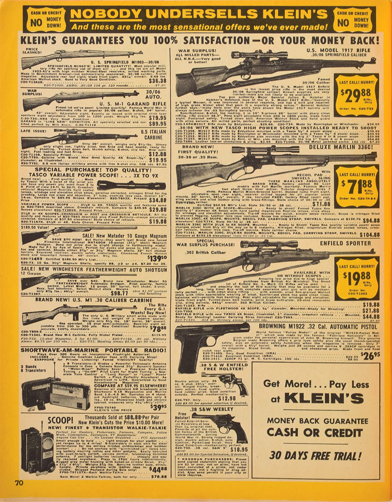 A 1963 issue of the Klein's Sporting Goods catalog, 8.5 x 11, 95 pages, featuring the "6.5 Italian Carbine" that Oswald ordered on page 70. The ad reads, in part: “Only 36″ overall, weighs only 5 1/2-lbs. Shows only slight use, lightly oiled, test fired and head spaced, ready for shooting. Turned down bolt, thumb safety, 6-shot, clip fed. Rear open sight. Fast loading and fast firing.” Oswald purchased the C20-T750 option for $19.95, which was equipped with “Brand New Good Quality 4X Scope.” In fine condition, with expected light age wear. Accompanied by a small copy of the 'A. Hidell' money order that the Warren Commission concluded Oswald used to purchase the gun from Klein's.