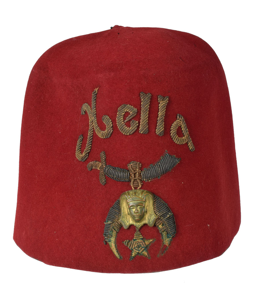 Vintage Masonic Shriners Hella ceremonial fez hat personally-owned and -used by legendary Dallas County Sheriff Richard Allen 'Smoot' Schmid. The fez bears an approximate diameter and height of 7.25″ and 7″, and retains its original black tassel and gold bullion design, showing a scimitar with a drop holding the crescent and sphinx. In fine condition, with expected wear from use.