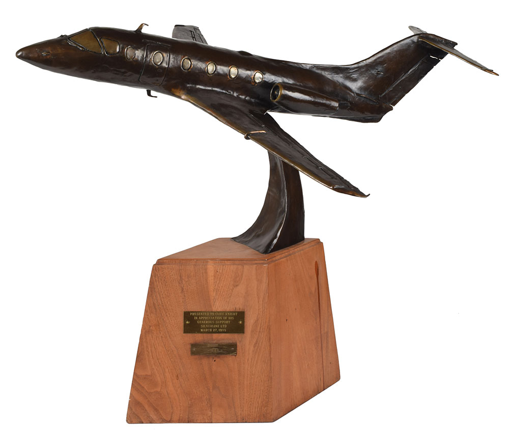 Large bronze airplane sculpture set upon a wooden base, measuring 29 x 31 x 26 and weighing 43 pounds, with a plaque on the base reading: "Presented to Cliff Knight, in appreciation of his generous support, Silverline Ltd, March 27, 1985." A plaque below bears an indistinct artist's signature. In fine condition, with an irregular line of varnish on the base. Please contact RR Auction for a shipping quote.