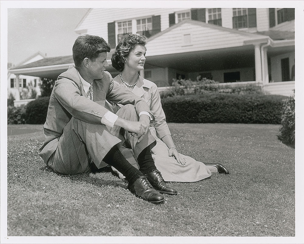 Striking first generation 8” x 10” silver gelatin photograph printed from the original 4” x 5” negative, showing the recently engaged John F. Kennedy and Jacqueline Bouvier sitting on the front lawn of the Kennedy compound in Hyannis Port in the summer of 1953. In very fine museum-quality condition. John and Jackie just months before they were married.