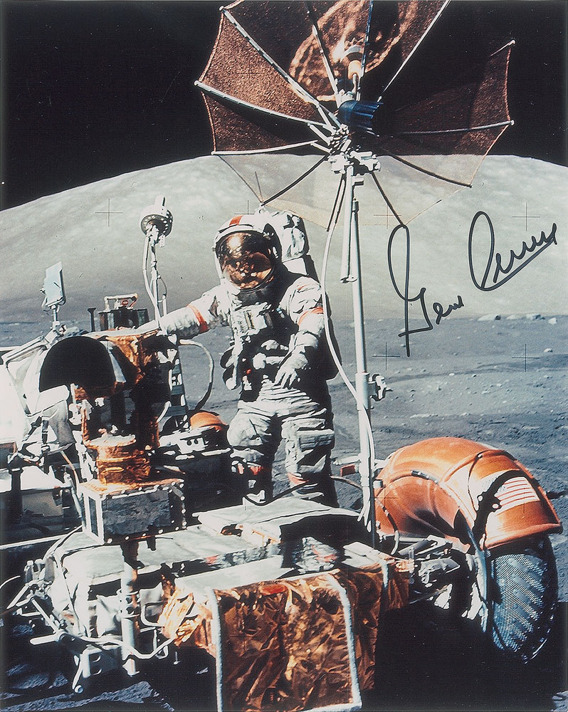 Color satin-finish 8 x 10 full-length photo of Cernan standing next to the lunar rover on the surface of the moon, signed in black felt tip. In fine condition.