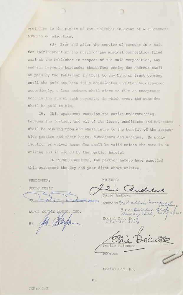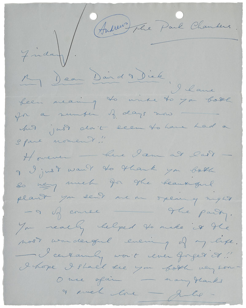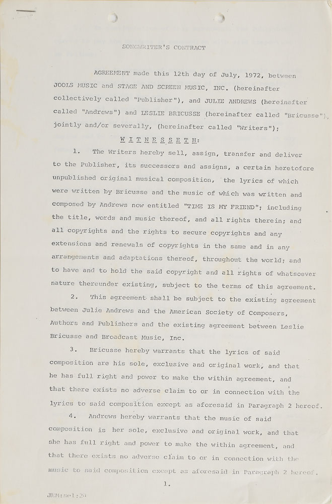 Two items: an ALS signed "Julie," one page, 7.5 x 9.5, no date, addressed to "David & Dick," in part: "I just want to thank you both so very much for the beautiful plant you sent me on opening night—& of course—the party. You really helped to make it the most wonderful evening of my life—I certainly won't ever forget it!!"; and a songwriter's contract signed "Julie Andrews," eight pages, 8.5 x 13, July 12, 1972, in which Julie Andrews and Leslie Bricusse agree to "sell, assign, transfer, and deliver" to Jools Music and Stage and Screen Music, Inc., "a certain heretofore unpublished original musical composition, the lyrics of which were written by Bricusse and the music of which was written and composed by Andrews now entitled 'Time Is My Friend.'" Signed at the conclusion in black felt tip by Andrews and Bricusse. In overall fine condition.